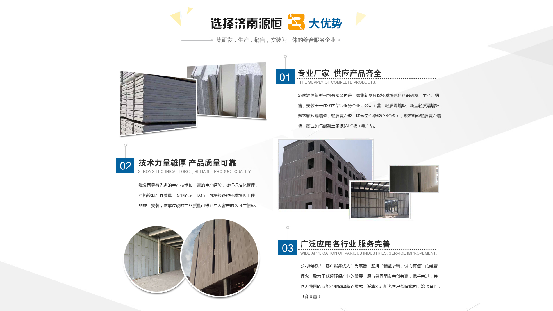 濟南源恒新型材料有限公司坐落于美麗的泉城濟南,是集新型環(huán)保輕質(zhì)墻體材料的研發(fā)、生產(chǎn)、銷售、安裝于一體化的綜合服務(wù)企業(yè)。我公司具有的生產(chǎn)技術(shù)和豐富的生產(chǎn)經(jīng)驗,為您提供輕質(zhì)隔墻板、新型輕質(zhì)隔墻板、聚苯顆粒隔墻板、輕質(zhì)復合板、陶粒空心條板(GRC板),聚苯顆粒輕質(zhì)復合墻板,蒸壓加氣混凝土條板(ALC板)等產(chǎn)品,本公司有專的施工隊伍,可承接各種輕質(zhì)墻板工程的施工安裝。輕質(zhì)隔墻板是國家推廣使用的新型輕質(zhì)、綠色無害建材,是墻改節(jié)能政策大力扶持的環(huán)保節(jié)能產(chǎn)品,是發(fā)達國家普遍采用的新型墻體材料。濟南源恒新型材料有限公司實行標準化管理,嚴格控制產(chǎn)品質(zhì)量,依靠過硬的產(chǎn)品質(zhì)量已得到廣大客戶的認可與信賴。公司產(chǎn)品遍布各大城市,與國內(nèi)多家客戶建立了良好的合作關(guān)系。公司始終以“客戶服務(wù)優(yōu)先”為宗旨,堅持“精益求精、誠而有信”的經(jīng)營理念,致力于低碳環(huán)保產(chǎn)業(yè)的發(fā)展,愿與各界朋友共創(chuàng)共贏,攜手共進,共同為我國的節(jié)能產(chǎn)業(yè)做出新的...